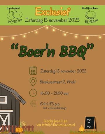 Op zaterdag 15 november organiseert Koffieschuur bij de Kers in Wehl een bijzondere Boer'n BBQ vol warmte, streekproducten en gezelligheid. Vanaf 16.00 uur zijn gasten welkom voor een welkomstdrankje, waarna een avond vol smaak en beleving volgt op het sfeervol aangeklede terras van de boerderij.